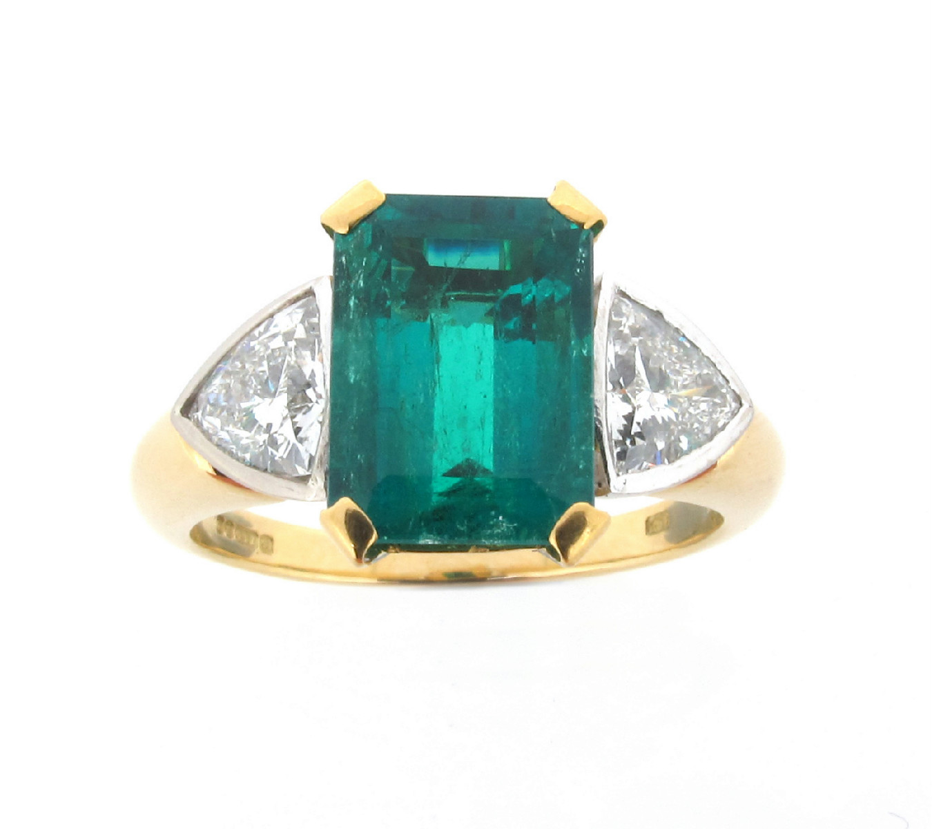 An emerald and diamond three stone ring, the emerald is set with two trigon shaped shoulder diamonds in 18ct yellow and white gold. Size S.