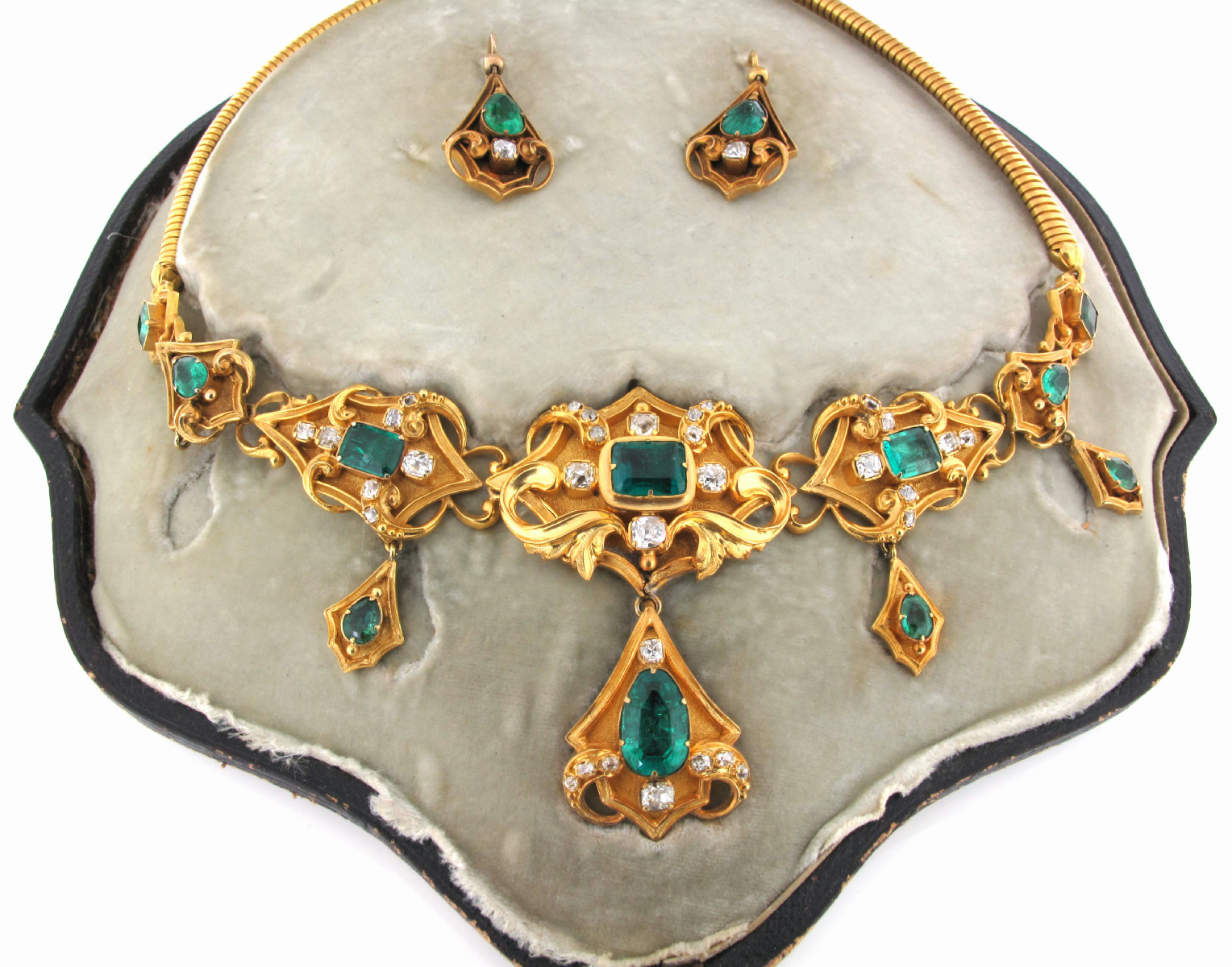 A Victorian emerald and diamond necklace, with matching earrings. The necklace mounted with seven rectangular and pear shaped emeralds within diamond set scrolls, suspending five emerald set gold pendants, the centre pendant set with further diamonds. And similar emerald and diamond set gold earrings. Fitted case.