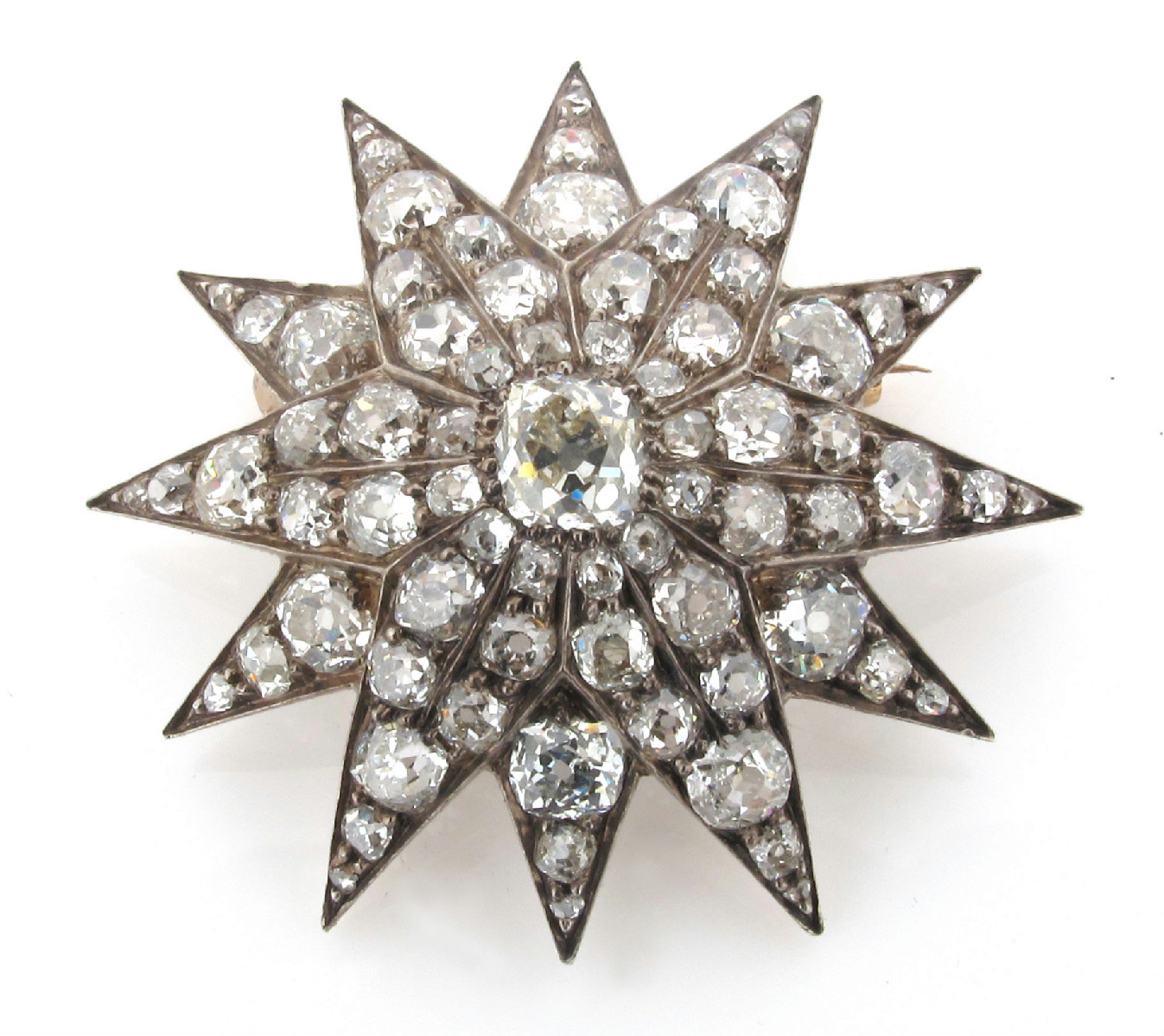 A late Victorian diamond set star brooch, centred with a cushion shaped diamond and further graduated smaller diamonds set to the twelve rays. In silver and gold. Detachable brooch fitting. Fitted case.
