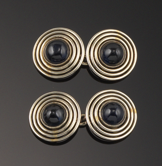A pair of sapphire mounted gold cuff links, each link centred with a cabochon sapphire within three concentric circles and millegrain set in gold. French control marks. Each link 1.8cm wide.