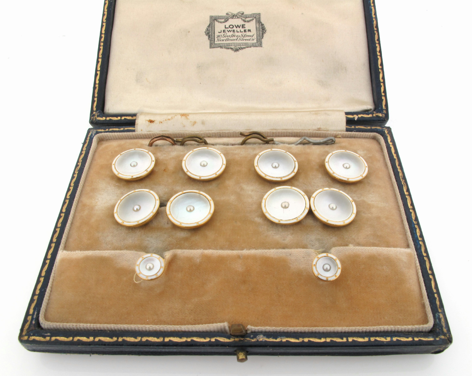 A cased set of dress cufflinks and studs, each formed with a pearl centred circular shell disc within a white enamel border and gold mounts. Comprising a pair of cuff links, four larger links and two smaller links. Fitted case.