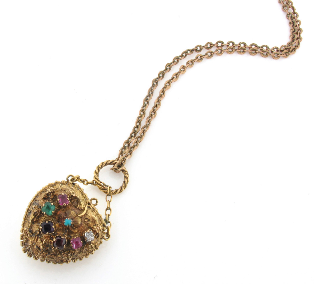 A Regency REGARD heart shaped locket pendant, the gold pendant with fruiting vine decoration on matted ground to the cover. Gem stones spelling REGARD and a small turquoise set forget me not. With foliate filigree decoration to the herringbone back section and centred with a turquoise cabochon on a fine link chain. 2cm wide.