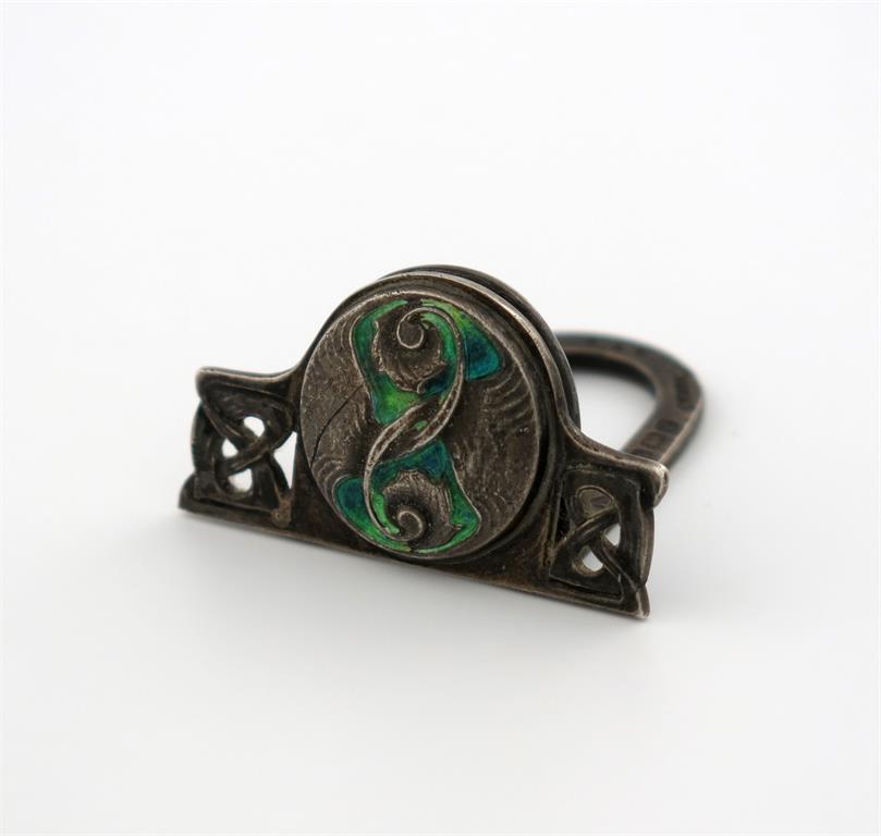By Liberty and Co, an Edwardian silver and enamel menu card holder,
