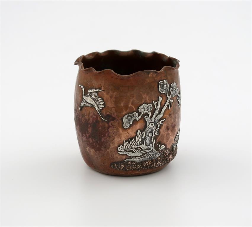 with a hammered finish, crimped rim and applied with silver decoration of a tree and birds of paradise, height 5.6cm.