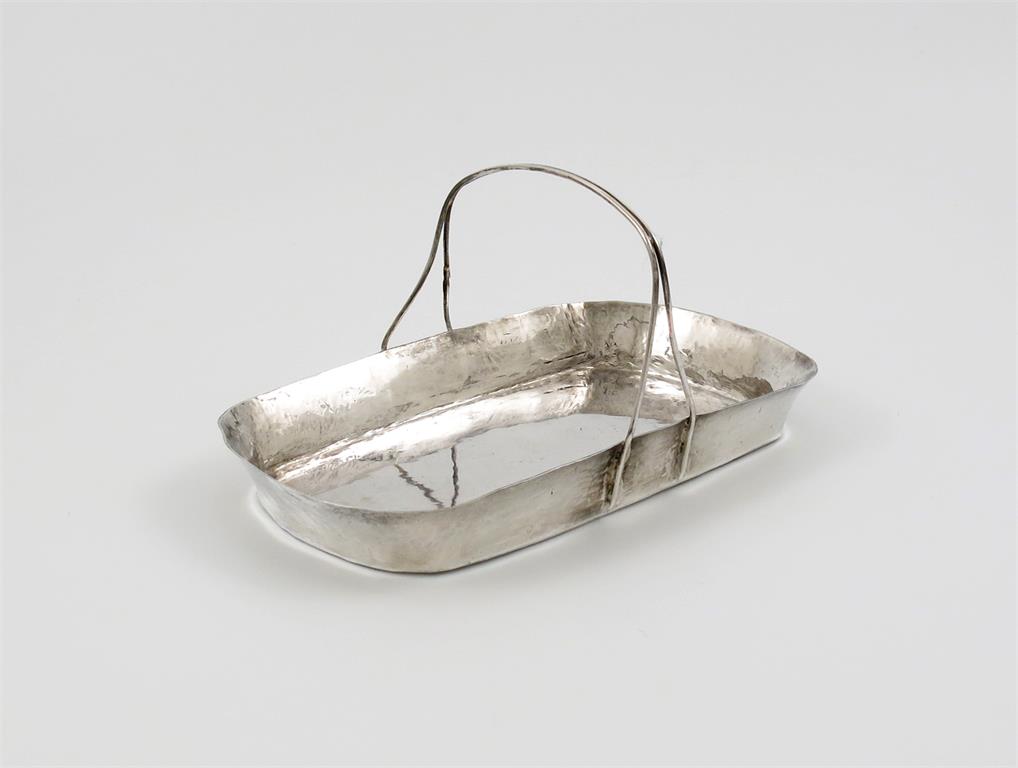 rounded rectangular form, spot-hammered decoration, wire-work handle, length 18.7cm, approx. weight 6.5oz.