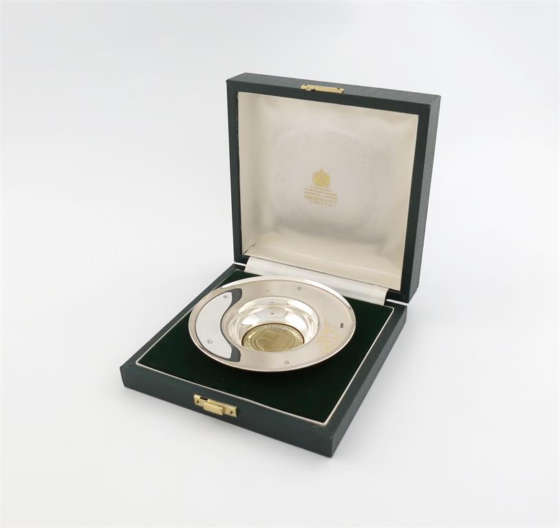 celebrating The Queen's Silver Jubilee, the centre with a silver-gilt inscription, in a fitted case, diameter 13.3cm, approx. weight 6oz.