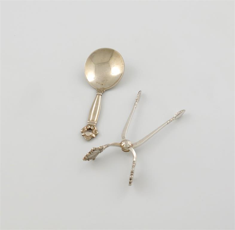 length 10.2cm, plus a pair of Danish silver Acanthus pattern sugar tongs, by Georg Jensen, again designed by Johan Rohde, length 10.4cm, approx. total weight 1.6oz. (2)