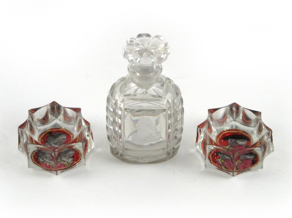 An Apsley Pellatt glass scent bottle and stopper 19th century, with a sulphide inclusion of a profile bust portrait, and a pair of glass salts, the wells painted to the underside with head and shoulders portraits of a young couple, small chips to the salts, 11cm max. (4)