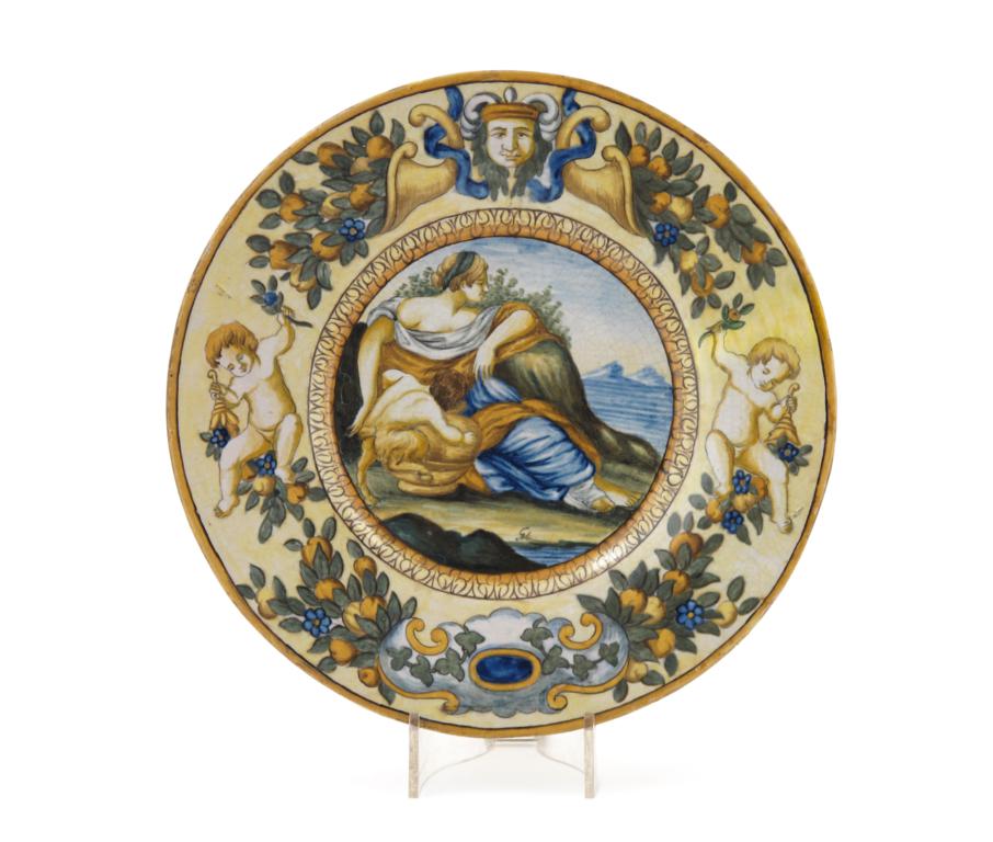 An Italian maiolica charger 19th century, painted in the Castelli manner with a maiden and a faun seated by a grassy knoll with water beyond, within a border of putti and fruiting cornucopia, signed with a monogram, 34.5cm.