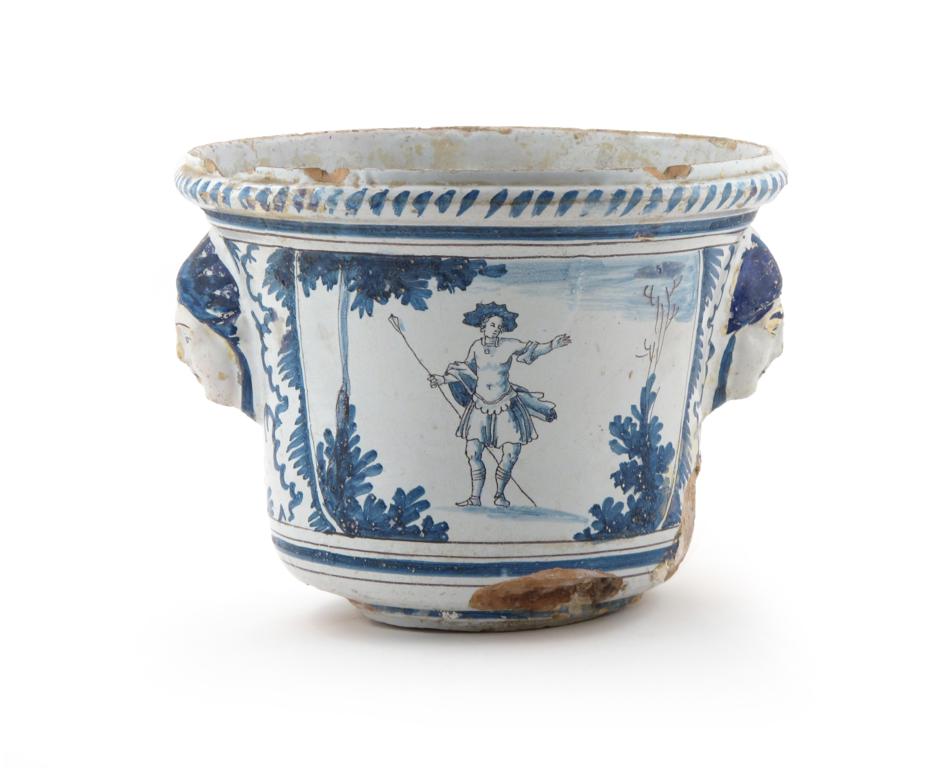 A large French faïence jardinière probably 19th century, one side painted in blue and manganese with a figure wearing a tunic and holding a spear, the other with buildings, between maskhead handles, blue dash rim, a section broken out but present, other chipping, 30cm high.