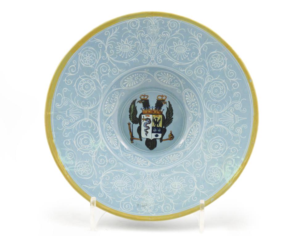 An Italian maiolica tondino 19th century, in the 16th century Faenza manner, the deep well painted with a coat of arms relating to the Habsburg Empire and the Duchy of Milan, the wide rim with a stylized foliate scroll design in bianco-sopra-bianco, incised numbers to the base, 27.3cm.