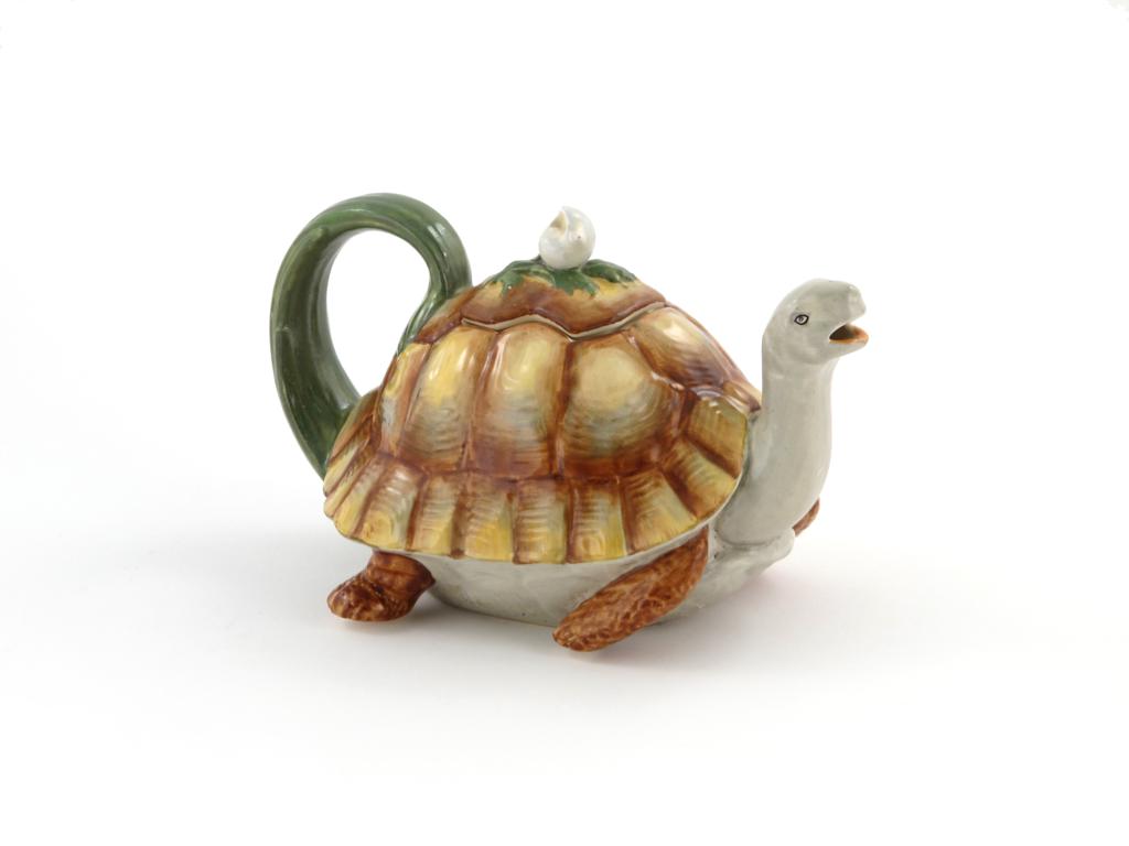 A rare Minton earthenware tortoise teapot and cover c.1895, naturalistically modelled and enamelled, his mouth forming the spout, the cover set into his back and with a finial formed from a seashell and seaweed frond, printed mark and moulded registration diamond, 22cm. (2)