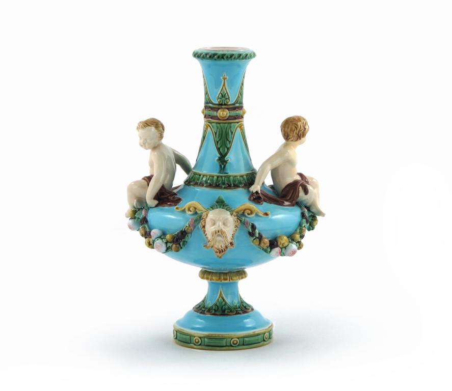 A Minton Majolica vase date code for 1871, two putti seated on the shoulders between garlands of fruit issuing from masks, the neck and foot with stylized leaf motifs, impressed mark, 29cm.