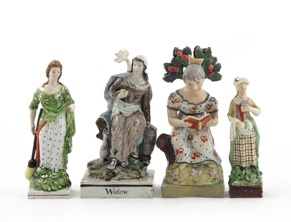 Four pearlware female figures 19th century, one of the Widow seated with a barrel of meal and a jar of oil, one of a young girl reading a book, one holding a broom, the other flowers, damages, 26cm max. (4)