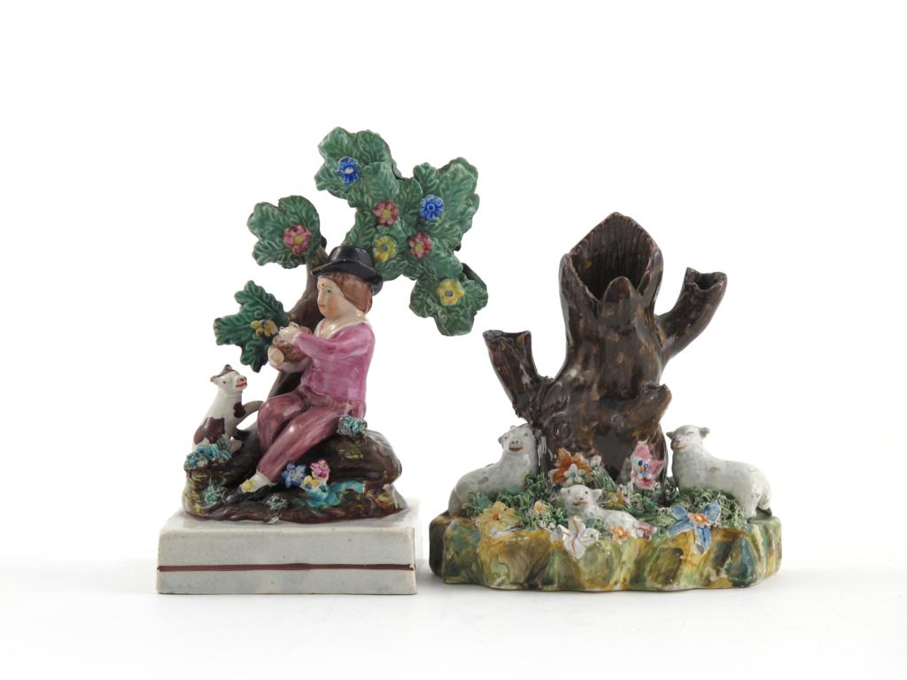 Two pearlware figure groups 19th century, one of a boy holding a bird's nest beneath a flowering tree, possibly emblematic of Spring, the other a spill vase group of a family of sheep beneath a hollow tree trunk, some restoration, 15.5cm max. (2)