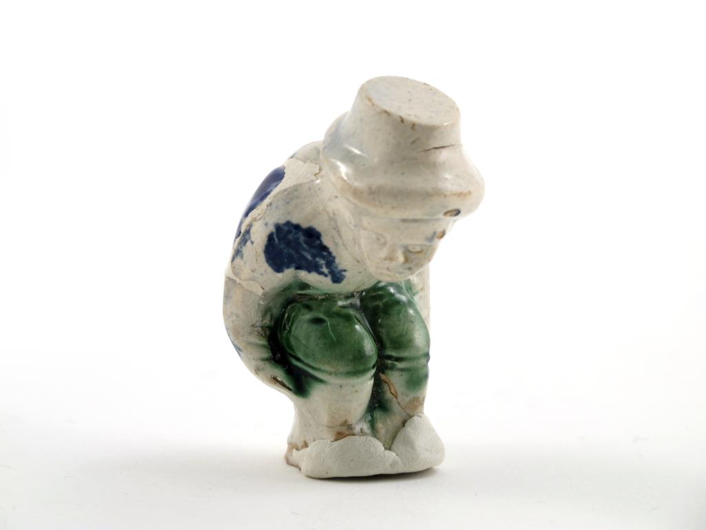 An unusual Pratt type figure of a boy late 18th/early 19th century, pulling his trousers around his ankles and exposing his buttocks, typically coloured in splashes of green, blue and ochre, damaged and repaired, 6cm.
