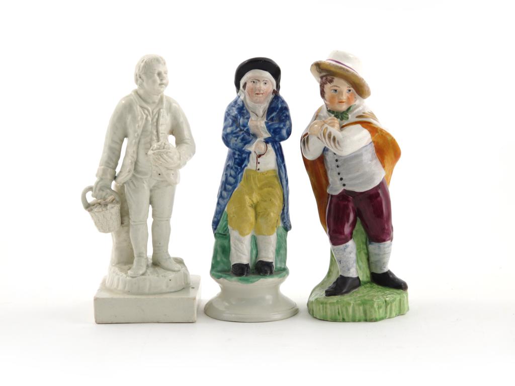 Two Staffordshire figures of Winter, personified as young boys huddling into their clothes, and a white-glazed figure of Spring, holding a basket of flowers and a bird's nest, some restoration, 16cm max. (3)