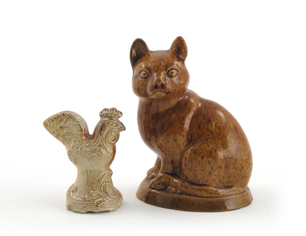 A treacle-glazed model of a cat 19th century, seated with its head turned to sinister, its tail curled about its paws, and a small stoneware model of a cockerel, tinged with brown and raised on a tall scrolling base, 15cm max. (2)