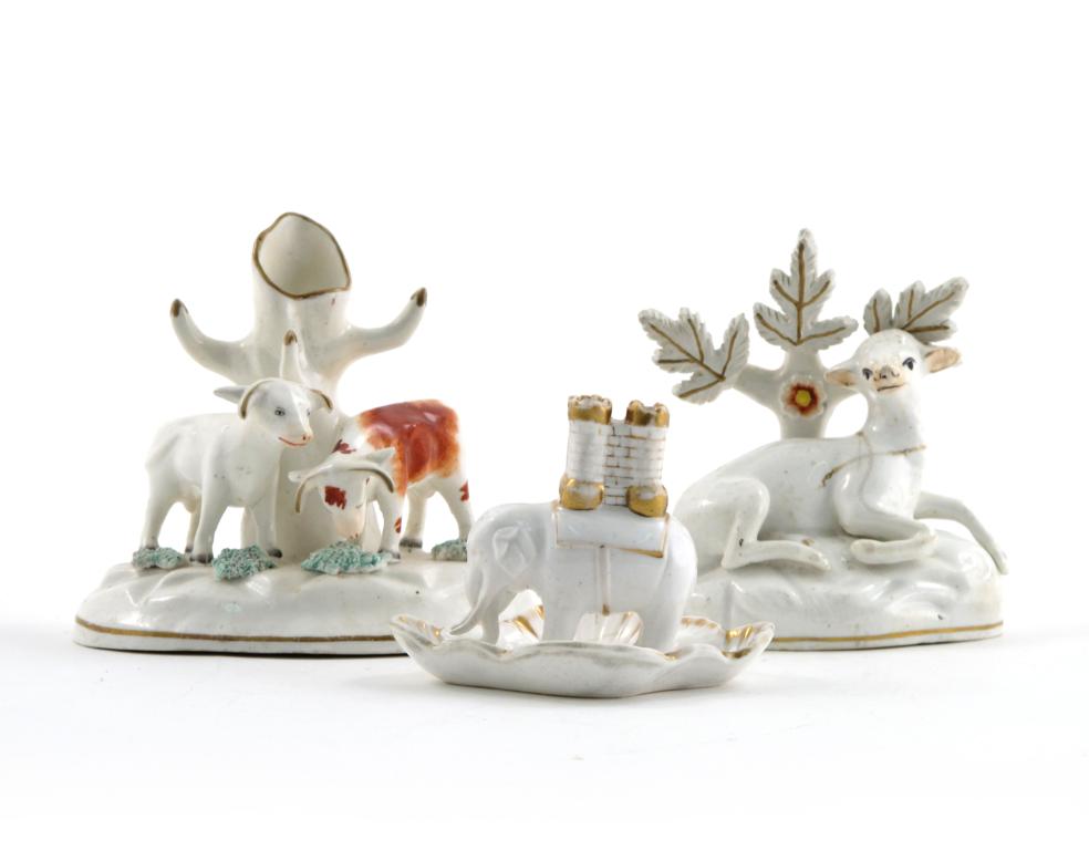 Three Staffordshire porcelain groups 1st half 19th century, one modelled as two cows beneath a spill formed as a tree trunk, one of a deer recumbent beneath bocage, the last of an elephant standing four square on a shaped dish with a castle on his back, some restoration, 11cm max. (3)