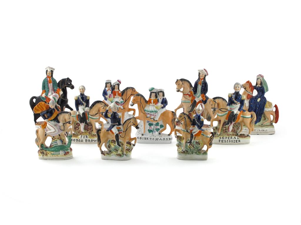 Ten Staffordshire equestrian groups 19th century, including Dick Turpin and Tom King, Going to Market and Returning Home, General Pelissier and Sir George Brown, the Empress of France, George and the Dragon, and a pair of Highland figures on horseback, 26cm max. (10)
