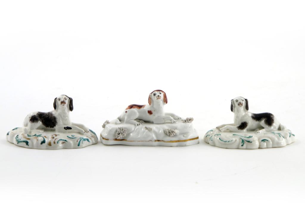 A pair of Staffordshire porcelain spaniels c.1830, recumbent with heads turned and raised on scrolling bases highlighted in green and gilt, and a similar recumbent dog with a red patched coat, 10cm max. (3)