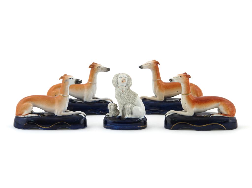Two pairs of Staffordshire greyhound inkwells 1st half 19th century, recumbent with forepaws crossed over blue oval cushions, and a Staffordshire model of a poodle and two puppies, faults to some, 16.5cm max. (5)