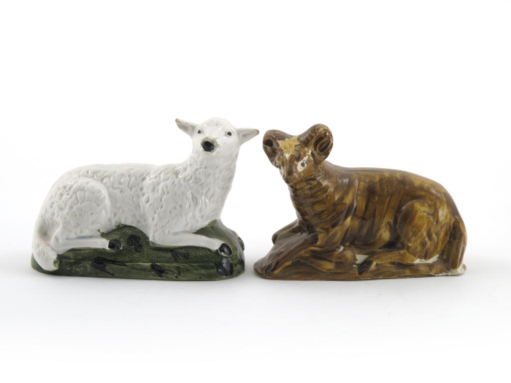 Two large pearlware models of sheep 1st half 19th century, one of Portobello type, recumbent on a base glazed in green and black, the other a recumbent ram decorated in an allover umber wash, 16cm. (2)