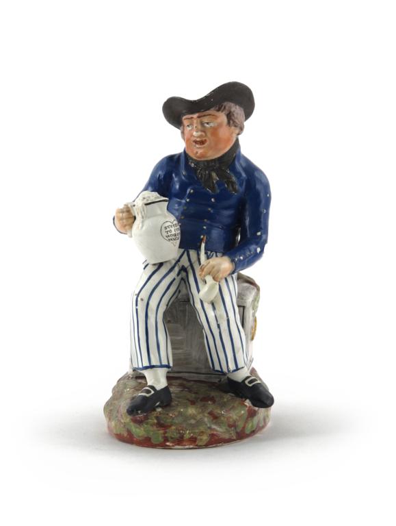 A small 'American Sailor' Toby jug c.1820, seated on a sea chest bearing the inscription 'Dollars' to two sides, his foaming jug of ale inscribed 'Success to the Wooden Walls', typically dressed in striped trousers and blue jacket, some faults, 26cm.