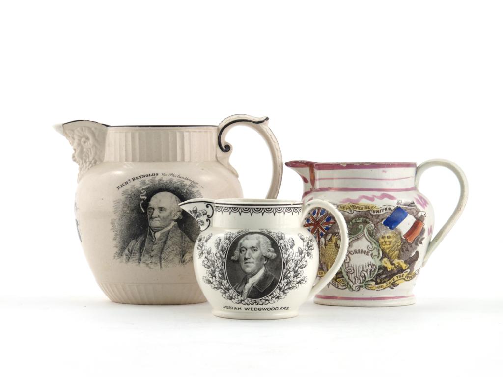 Three pearlware jugs early 19th century and later, one printed with a portrait of the Quaker and philanthropist, Richard Reynolds, the reverse with a stanza mourning his demise, one a Sunderland lustre jug of Crimean interest, the last a Wedgwood commemorative jug for the bicentenary in 1930, some small faults, 16cm high max. (3)