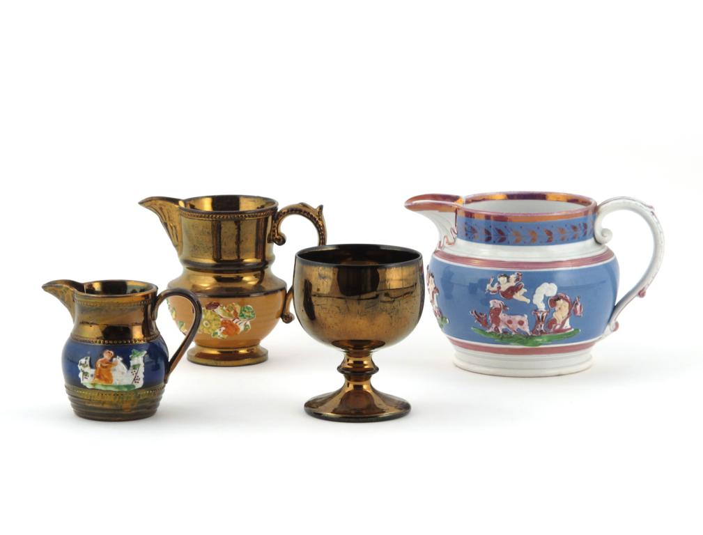 Three moulded pearlware jugs 19th century, the largest applied with Classical figures in carriages drawn by animals, highlighted with purple lustre, two applied with children or flowers on a copper lustre ground, and a copper lustre goblet, 19cm max. (4)