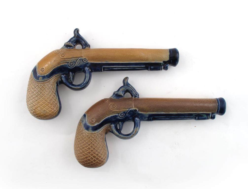 A pair of stoneware pistol flasks 19th century, modelled with hollow barrels and highlighted with a blue glaze, 20.5cm. (2)