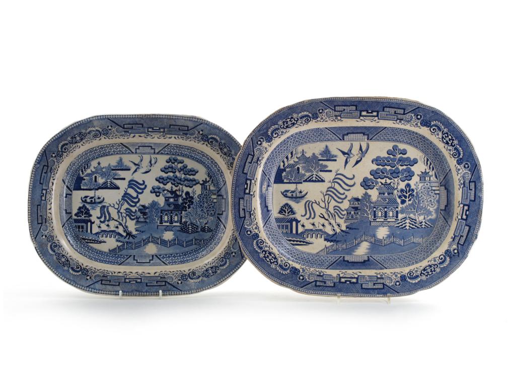 Two large pearlware blue and white chargers 19th century, printed with the Broseley pattern, 47cm max. (2)