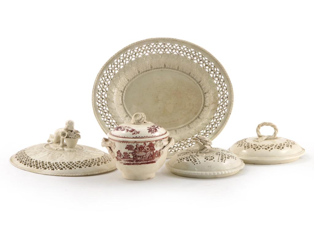 A creamware sugar bowl and cover late 18th century, printed in red with the Lovers Disturbed, the reverse with a reclining shepherd, three reticulated creamware tureen covers and an oval stand, 24cm max. (6)