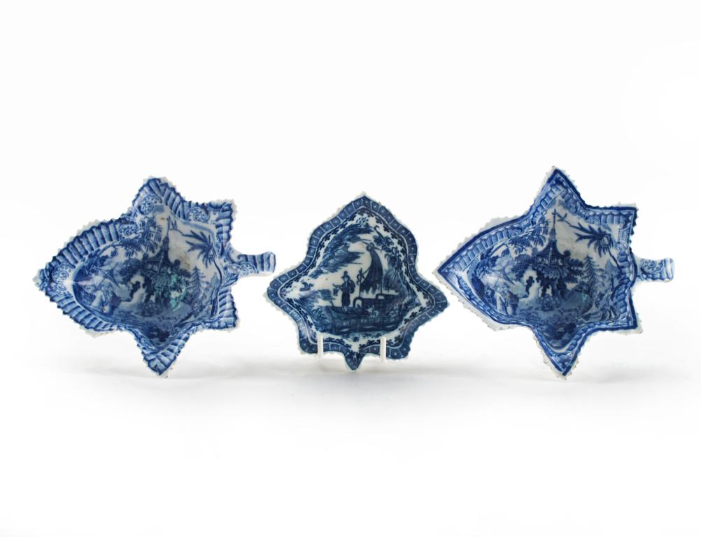 A pair of pearlware blue and white leaf pickle dishes 1st half 19th century, printed with Oriental figures beneath a domed parasol in an exotic landscape, and a Caughley pickle dish printed with the Fisherman and Cormorant pattern, 14.5cm max. (3)