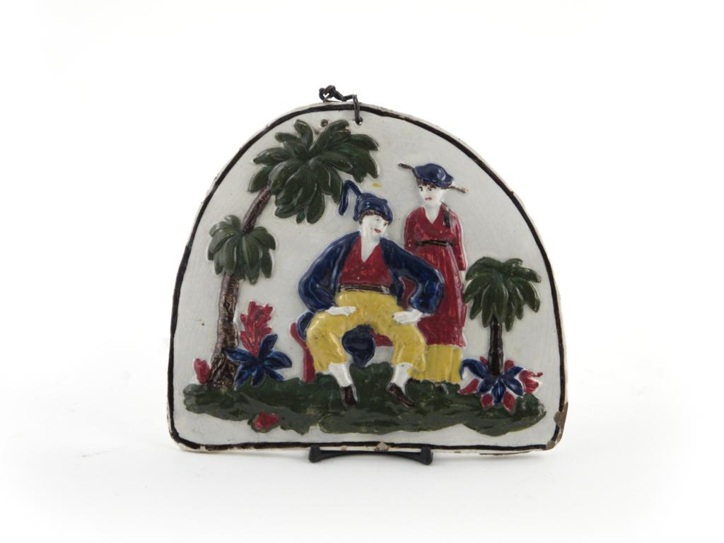 A pearlware plaque early 19th century, of Portobello type, moulded and enamelled with a gentleman in Eastern dress seated beneath a palm tree with a lady by his side, some chipping to the edge, 16cm.