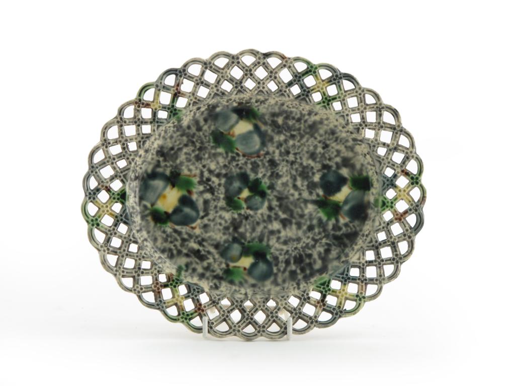 A Whieldon-type creamware dish c.1800, decorated with patches of green and yellow glaze on an unusual greyish blue sponged ground, the rim pierced, 24cm.