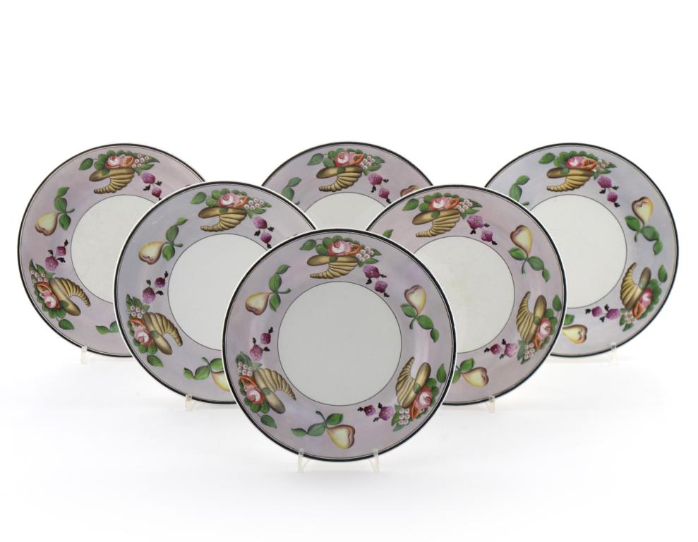 Six Wedgwood creamware plates c.1810-20, decorated with flowering cornucopia and leafy pears on a pale lilac ground, impressed marks, 20.2cm. (6)