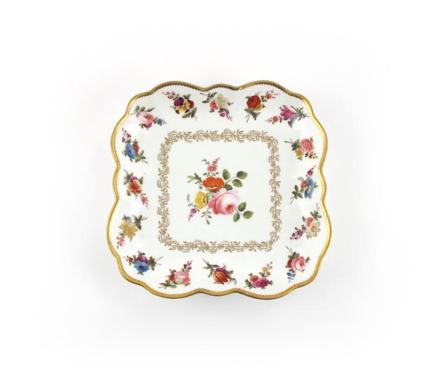 A Swansea porcelain square dish c.1820, painted with a central flower spray within a gilt garland border, the shaped rim with further narrow floral posies, impressed mark, a faint 3cm hairline, 28.5cm.