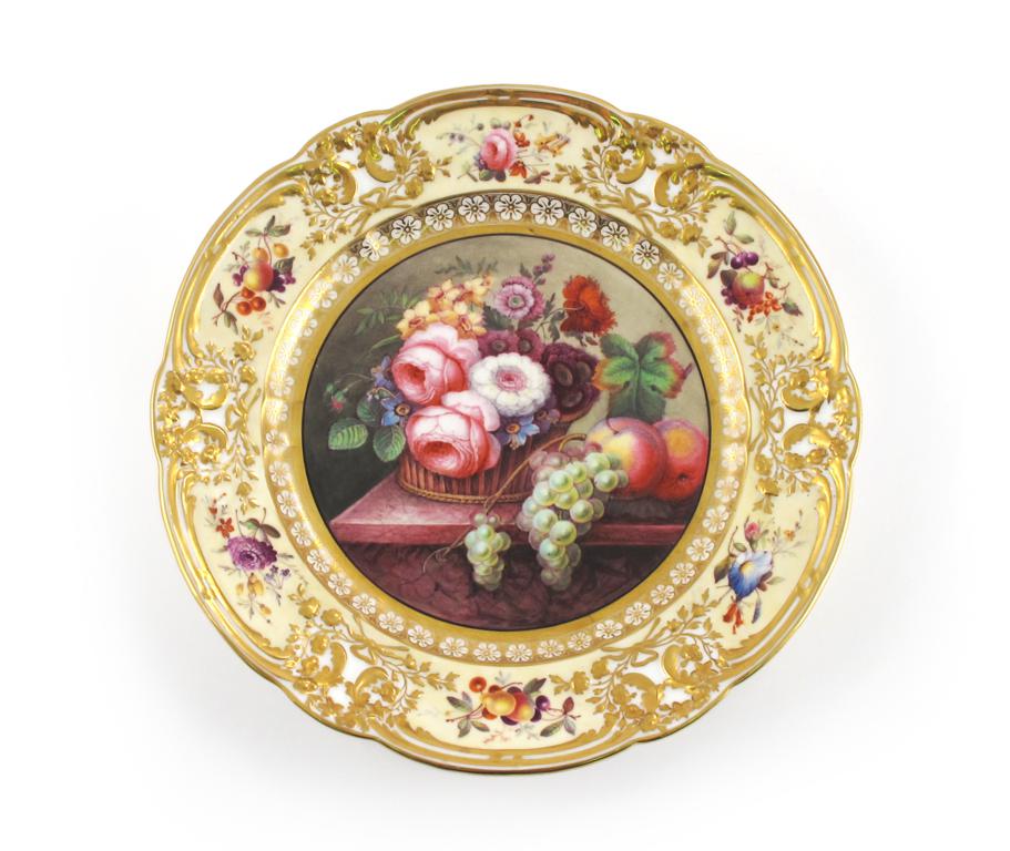 A fine London-decorated Nantgarw plate c.1820, painted perhaps by Moses Webster at Robin and Randall with a basket of flowers resting on the edge of a table with apples and bunches of grapes, the C-scrolled border picked out in gilt and painted with further small flower sprays and arrangements of fruit on a buttermilk ground, impressed Nantgarw CW, 25.3cm.