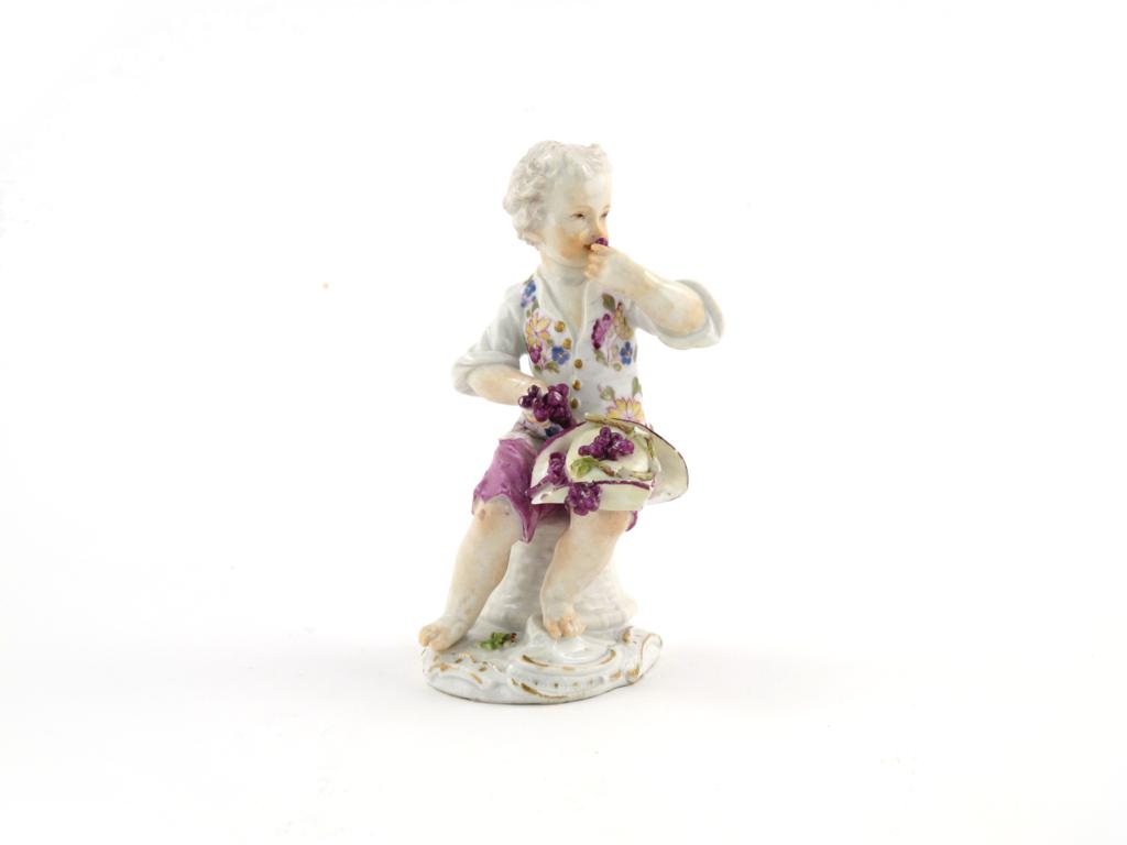 A Meissen figure of a boy mid 18th century, seated on a stump and eating grapes, his hat resting in his lap, blue crossed swords mark and incised '16' to the back of the base, some chipping, 12cm.