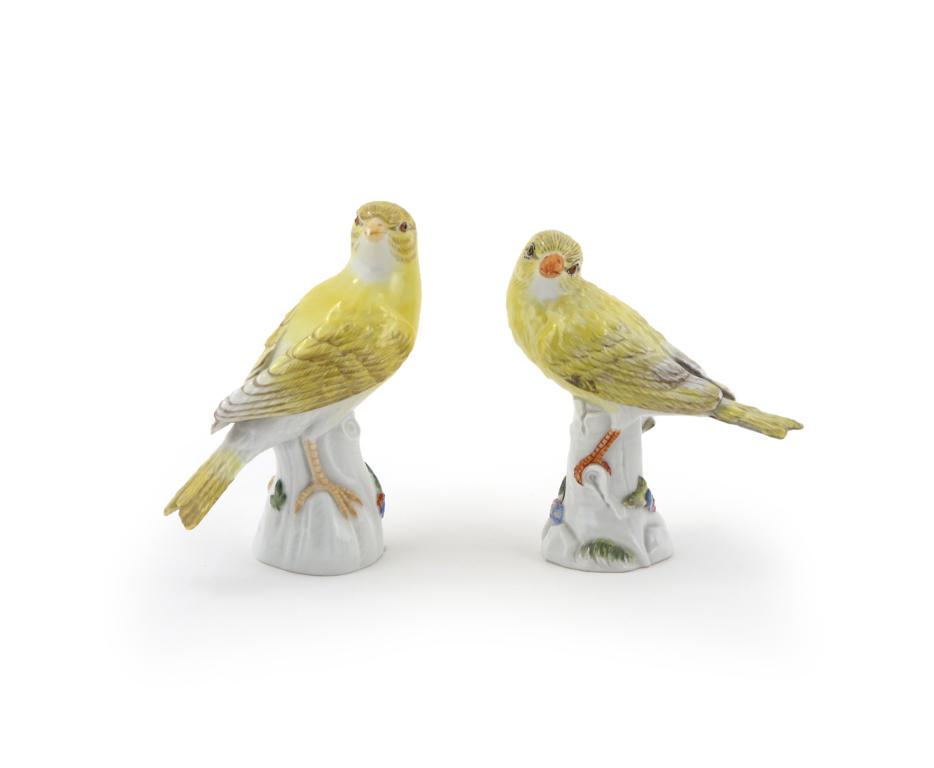 A pair of Meissen models of yellow canaries modern, perched atop stumps with heads turned, their plumage brightly defined, blue crossed swords marks, a few small chips, 9.5cm high. (2)