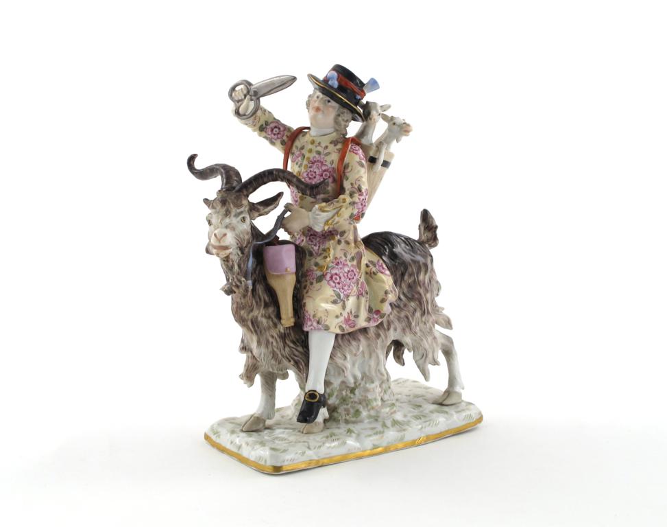 A Meissen figure of Count Bruhl's Tailor 19th century, the eccentric figure astride a goat with a bucket of two kids strapped to his back, brandishing a large pair of scissors, blue crossed swords mark, chips and restoration to the reins, 21cm high.