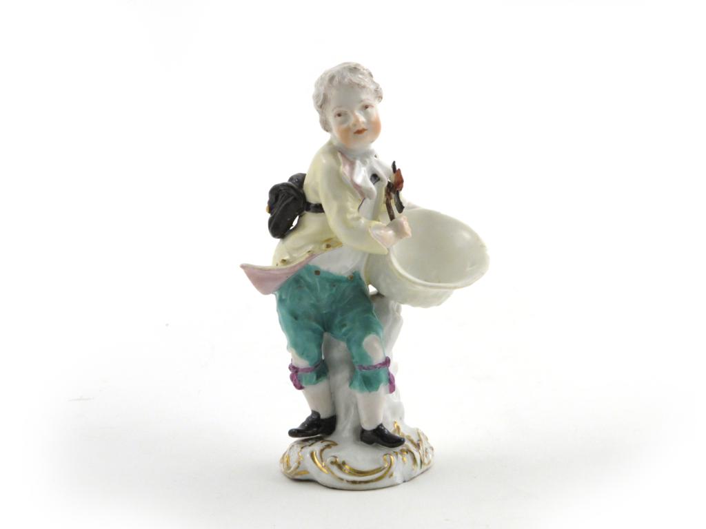 A small Meissen sweetmeat figure mid 18th century, modelled as a ragged young boy holding a large upturned straw hat beneath his left arm, a miniature windmill in his right hand, blue crossed swords mark to the reverse, a few tiny chips, 11.5cm.
