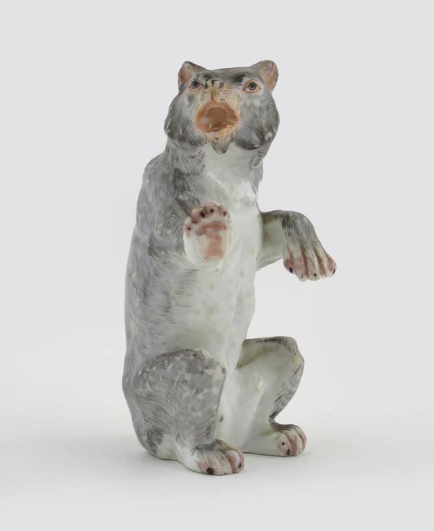 A Continental porcelain model of a bear 19th century, resting on his haunches with right forepaw outstretched and teeth bared, his grey coat finely detailed, some wear, 12.5cm.