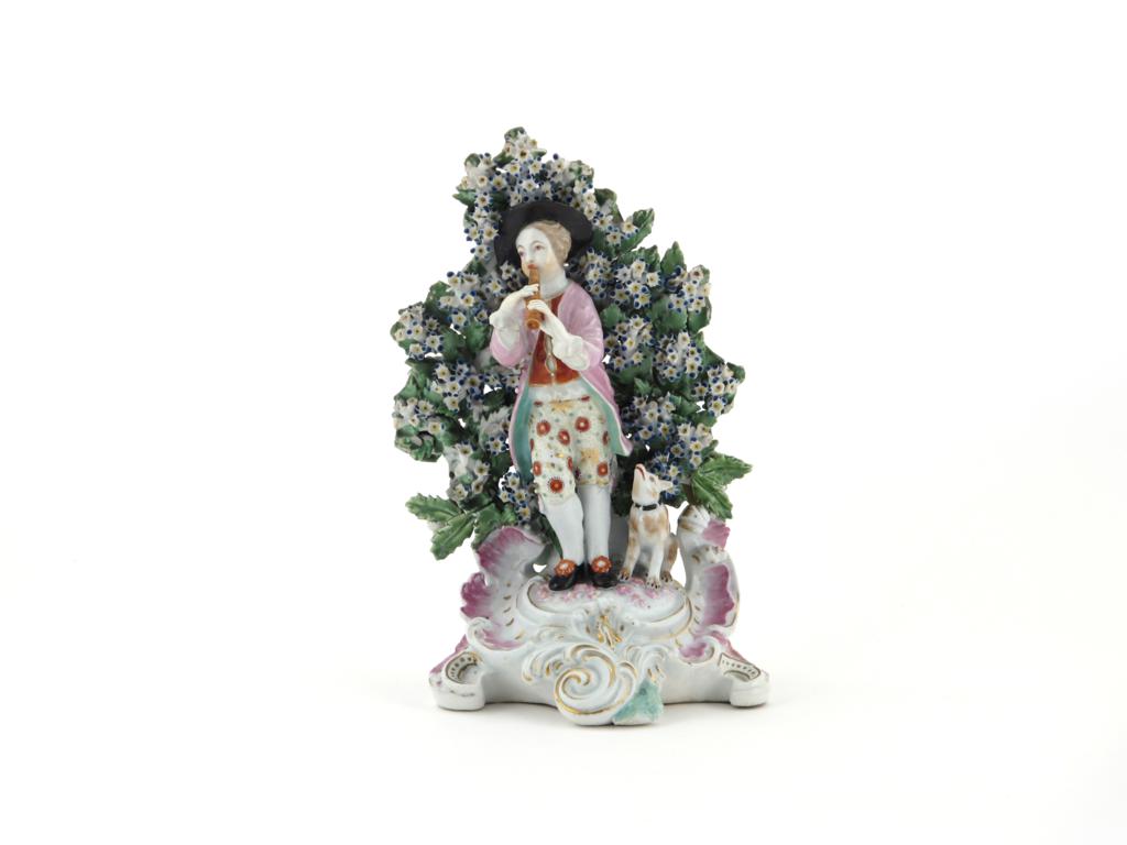 A Derby figure of a musician c.1765, playing the flageolet while his dog waits patiently at his side, standing before flowering bocage and raised on a tall scrolling base, his hands restored, 21.5cm.