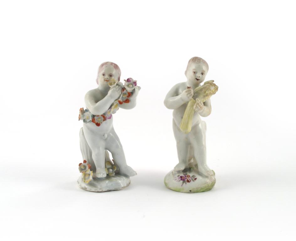 A matched pair of Derby figures of Seasons c.1758-60, of Spring and Summer, scantily clad and holding a garland of flowers and a sheaf of corn respectively, small damages, 10cm max. (2)
