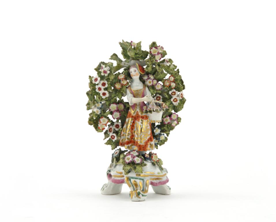 A Bow miniature figure of a gardener's companion c.1765-70, holding a basket of flowers and standing before tall flowering bocage, raised on a high tripod base, red anchor and dagger mark to the reverse, her right arm restored, 16.5cm.