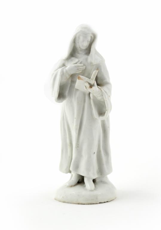 A Bow white-glazed figure of an Abbess c.1755, standing and holding an open book in her left hand, her right resting on her heart in a penitent manner, a chip to the book and her forefinger, 16cm.