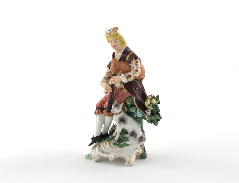 A Derby figure of a piper shepherd c.1775-80, seated on a flowering stump, his bagpipes tucked under one arm, his dog seated by his side on a scrolled base, incised 'No. 301' and further incised marks, some faults, 18cm.