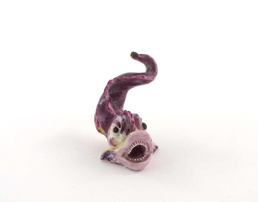A rare Bow model of a dolphin c.1755, mythically moulded with teeth bared and scaly tail spiralling upwards, enamelled in shades of pink and yellow, the end of the tail lacking, 11cm high.